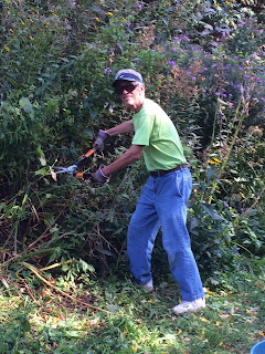 Ken just finished cutting Joe Pye Weed. Surrounding Ken are more green plants. If you look closely over Ken's left shoulder are purple blooming Asters. As these glorious summer days transition into fall, the Asters, along with other plants, will turn brown and go into dormancy, finding what they need as winter descends on the Gardens.